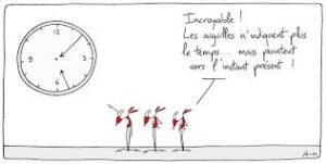 La relation au futur vient par le fait que la personne n’arrive pas à accepter la situation actuelle, néanmoins son psychisme a besoin d’activité en construisant des projections, hypothèses qui n’ont pour objectifs que de réassurer la personne en souffrance. C’est un réel effort que de rester dans la perception du maintenant. Cependant, en relation avec la personne dans le cabinet, le « maintenant » peut aussi être le rire, la sociabilité, la marque de respect et l’humanité.