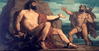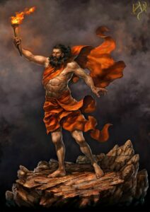Les yeux de Zeus, auxquels nul n’échappe, veillent sur son royaume. Il reconnaît aisément dans l’acte déloyal son auteur et convoque de suite Héphaïstos. Le gnome boiteux et difforme quitte son univers sidéral pour s’entendre réprimander : « Tu es le gardien du feu, nul autre que toi n’est habilité à user de l’élément igné. Sors de ton monde souterrain et regarde que partout les mortels utilisent le feu. Seul Prométhée peut oser se compromettre contre moi. Il n’a pu voler le feu que dans tes forges. Tu es maître dans l’usinage des métaux et tu as tout à apprendre dans l’art de la vigilance ».
